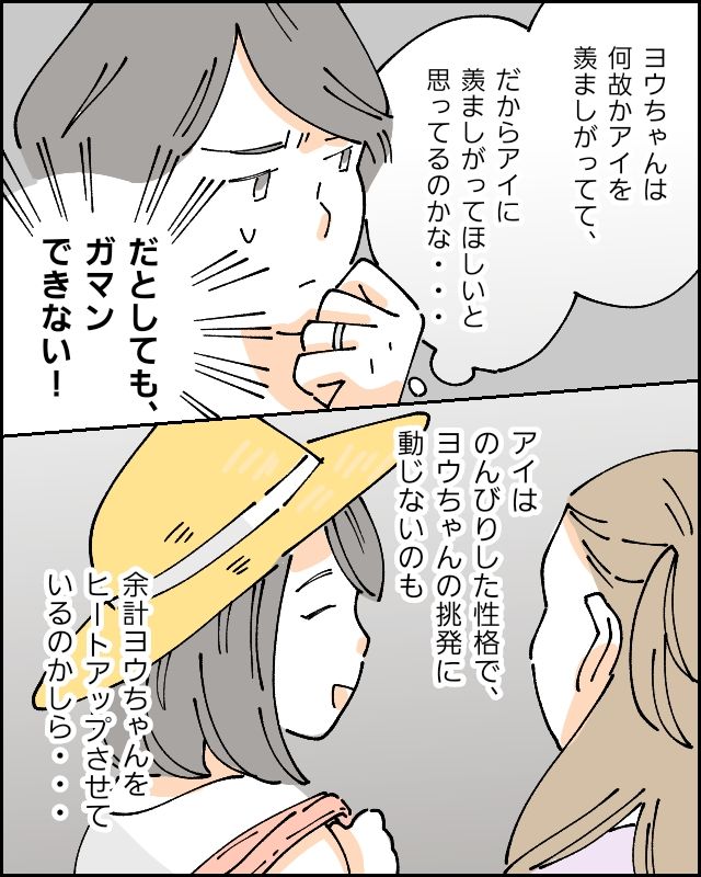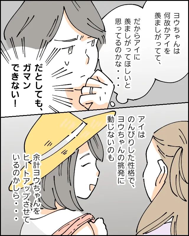 ヨウちゃんの行動から思い当たるのは、「ヨウちゃんは何故かアイを羨ましがってて、だからアイに羨ましがってほしいと思ってるのかな・・」と推測するも「だとしてもガマンできない!」という結論に。