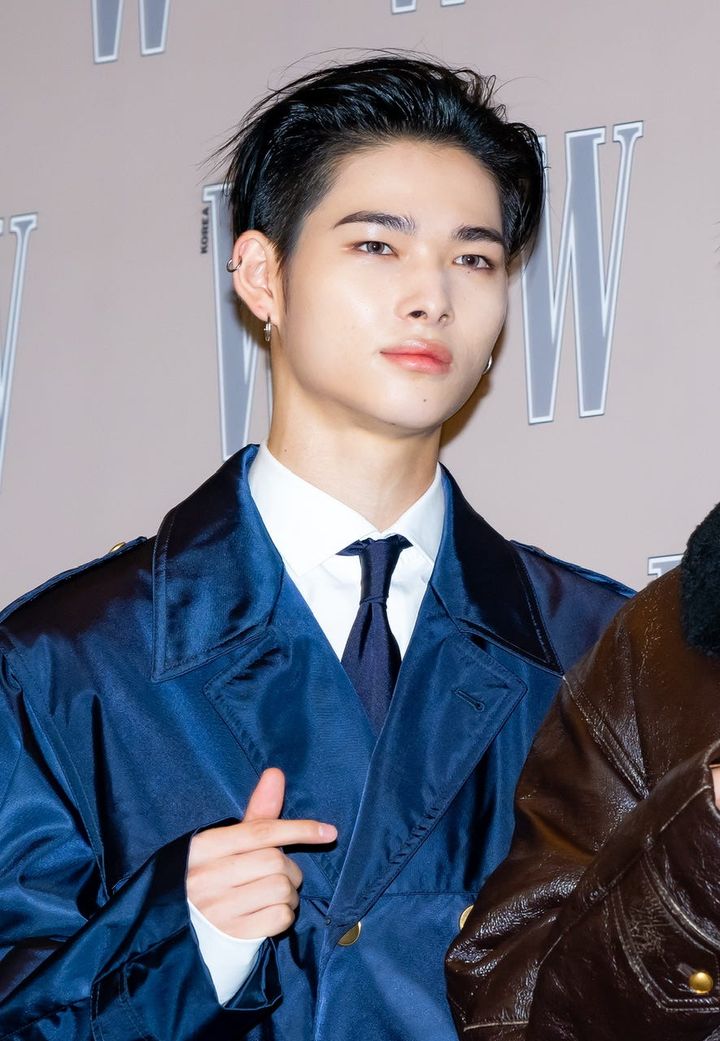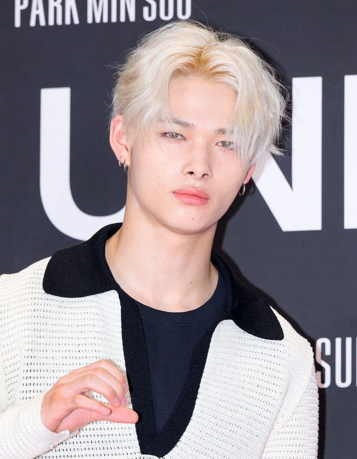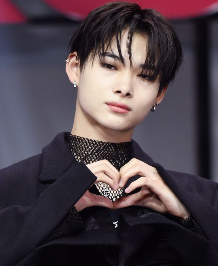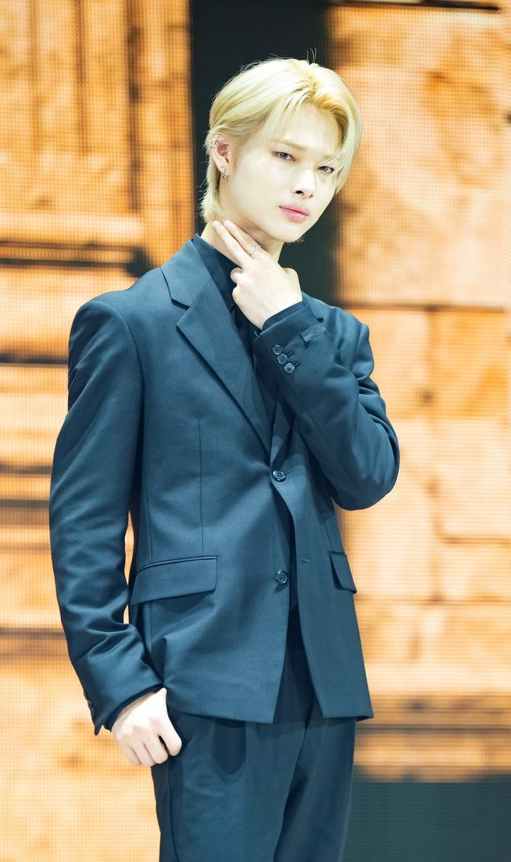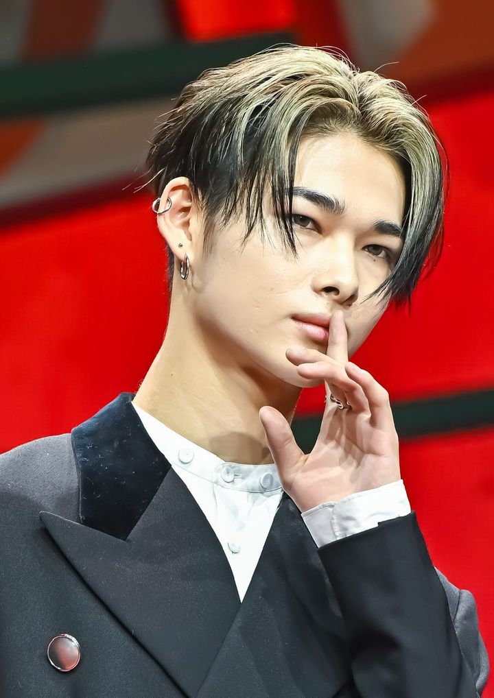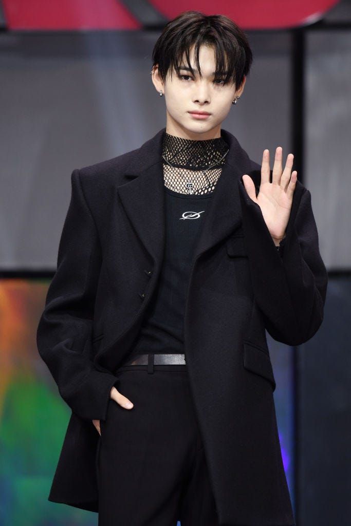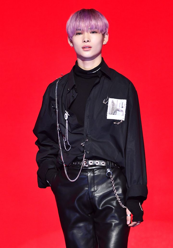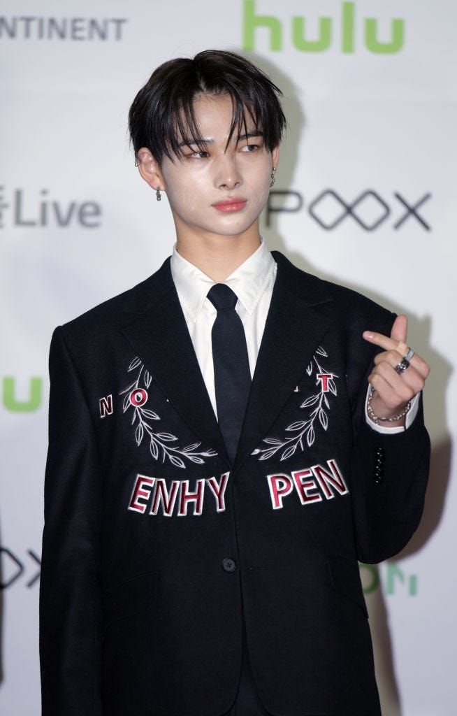5thミニアルバム『ORANGE BLOOD』のショーケースを行ったENHYPEN。ニキは濡れ感のあるヘアスタイル&囲み目メイクでダークな雰囲気を漂わせて。