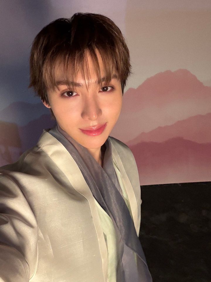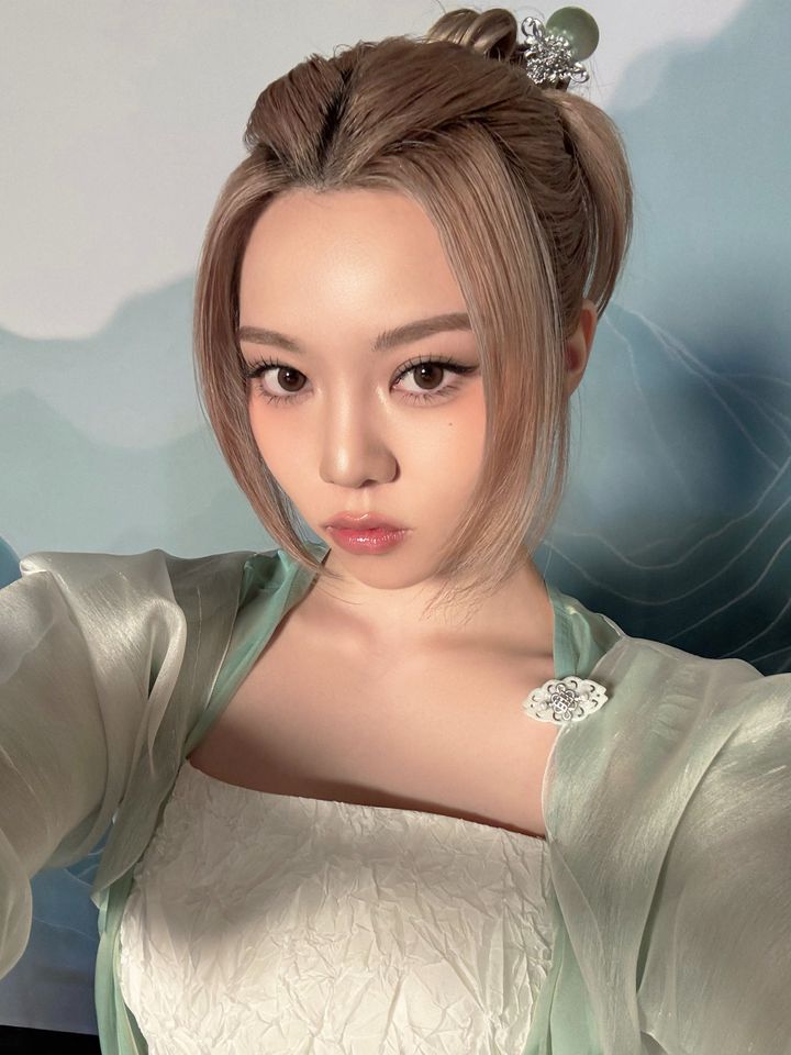 前髪を下ろした控えめなヘアスタイルが韓服とマッチし、爽やかなオーラをまとったウチャン。ピンクリップやほんのり血色感のあるベースメイクで、ナチュラルな魅力を引き立てて。