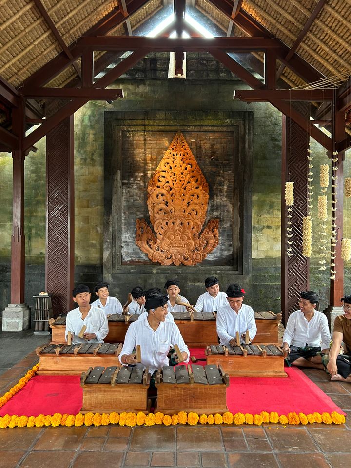 寺院セレモニーで、バリ島の伝統的な打楽器をロビーで演奏する現地の少年たち。 Hearst Owned