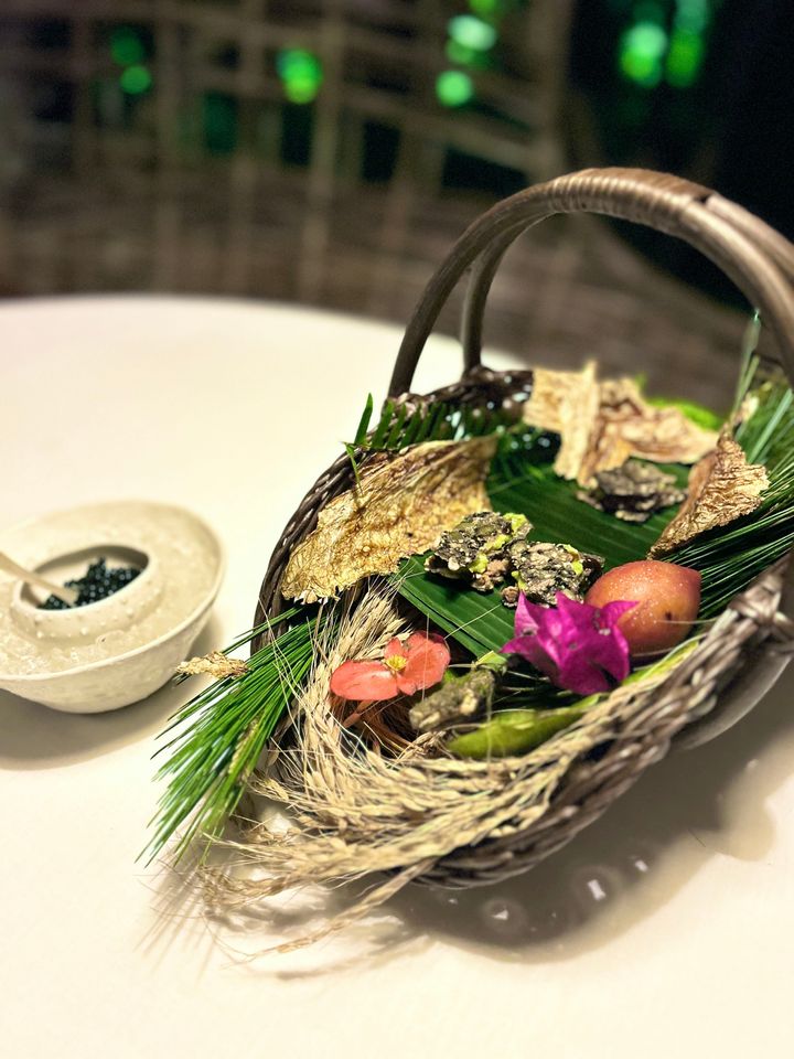 食品廃棄物ゼロをモットーにするシェフのエカ氏は、ウブドの北、ブアハン村のジャングルで採れるもので育った、ローカル愛あふれる実力派。食材はすべて100km以内から調達するこだわりで、バリ島のジャングル、山、そして海といった多様な生態系の恵みがテーブルにのぼる。ここならではのハーブや野菜、木の実、そしてジャワ島の希少なオーガニック和牛……地のものをふんだんに使って仕上げられた繊細で華やかな料理を味わうほどに、この土地のエネルギーで心身が満たされた。
