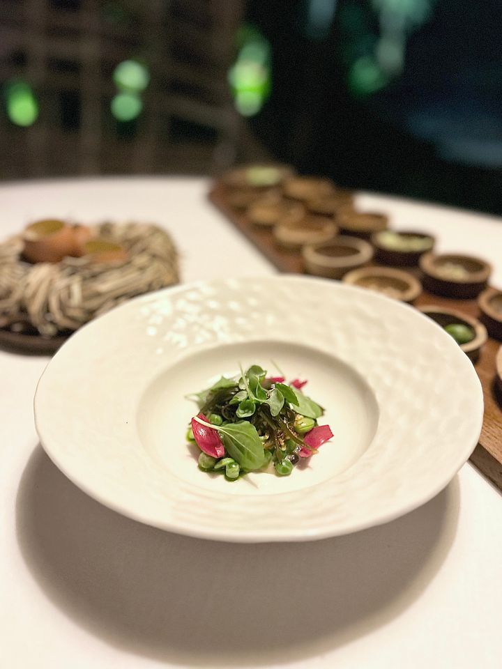 10周年を記念したコース「A DECADE OF KUBU EXPERIENCE」全10品Rp 1,250,000より「Ubud Shrubs」。アボカドやパラミツ、マルチシードを混ぜて焼いたものを、魚醤で味付けされた白菜に巻いて。海藻キャビアもアクセントに。 Hearst Owned