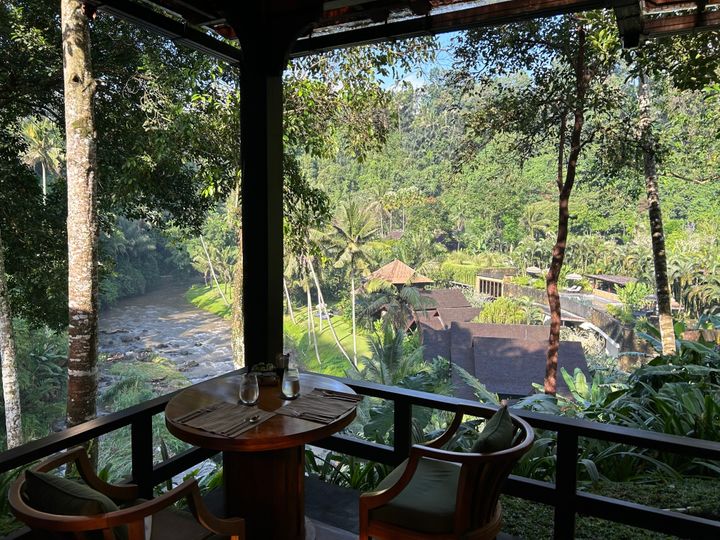 ホテルステイでの楽しみのひとつが朝食だが、ここでは目覚めからポジティブバイブスで満たされる。朝食会場の「Sawah Terrace(サワテラス)」は、アユン川とジャングルを望む特等席。朝日が差し込む渓谷には川のせせらぎや鳥の鳴き声が響き、あまりの清々しさにしばし多幸感にふけること間違いなし。野生のリスもすばしっこく木々を駆け回っていてかわいすぎた。