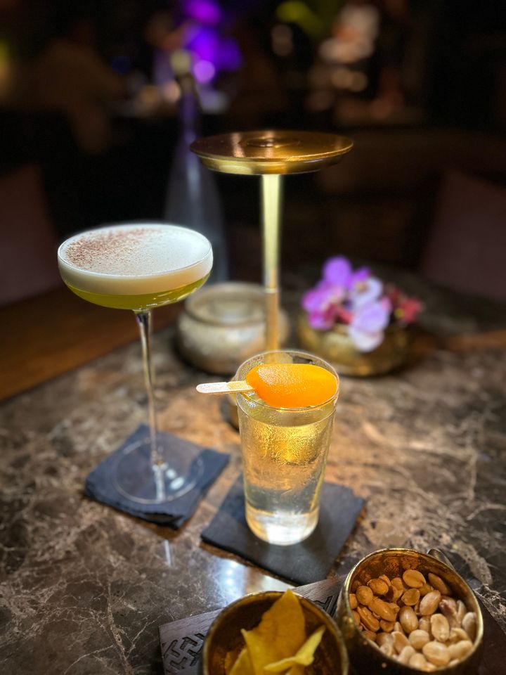 左から、代謝促進や炎症を防ぐといわれるシナモンの葉に着目したジンベースの「Amber Aperitivo」、免疫力向上が期待できるパッションフルーツのアイスと、安眠を促し痛みを和らげるというレモングラスが香り立つ「Ubud Hi-Ball」。共にRp 185,000。 Hearst Owned