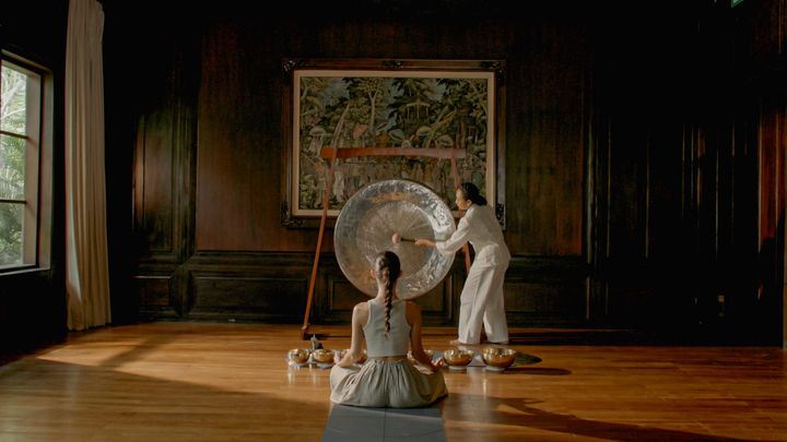 今回体験したのは、“音のシャワー”ともいわれる「ゴング バス セラピー」。シンギングボウルやゴング(銅鑼)の音や振動を全身で浴びることで、深いリラクゼーションや瞑想状態へ導いてくれるという。初体験だったが、仰向けになって耳を澄ましていると意識は静まり返ってやがて眠りに近い状態に。でも、睡眠とはまた違って、幾重にも重なる音色に包み込まれ、自分の輪郭が曖昧になって音とひとつに溶けてしまうような感覚。慌ただしい日々でぎゅうぎゅうに詰まっていた心と頭が、軽やかに浄化されていくようだった。外界から隔絶されたジャングルの神聖な空気のなかで行うそれは、単なるアクティビティを超えて“自分自身に戻るための時間”という印象。