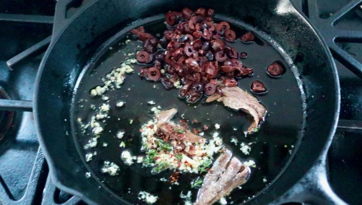 2.唐辛子、オリーブ、アンチョビ、オレガノを加え、ヘラでアンチョビを潰しながらオイルに溶かす。