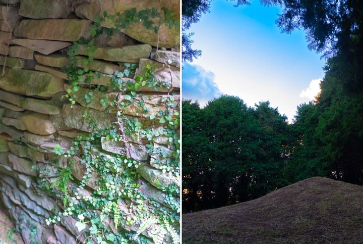 左:石室の入口には花や酒などが備えられている 右:前方部には道が引かれており、写真映えも◎