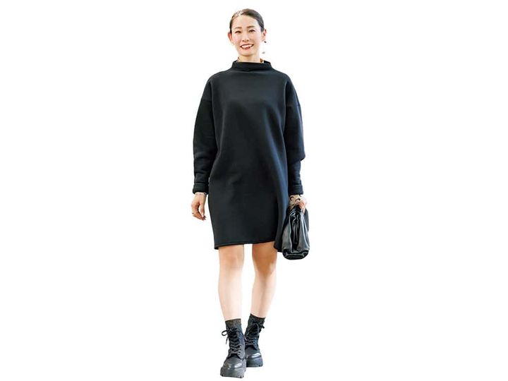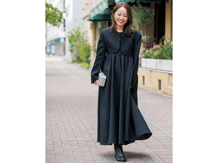 『お互い仕事で忙しく飛び回っているので、年1、2度は夫婦で食事を楽しむように。黒ワンピもアルミバッグやTabiブーツでモード感を忘れません。』