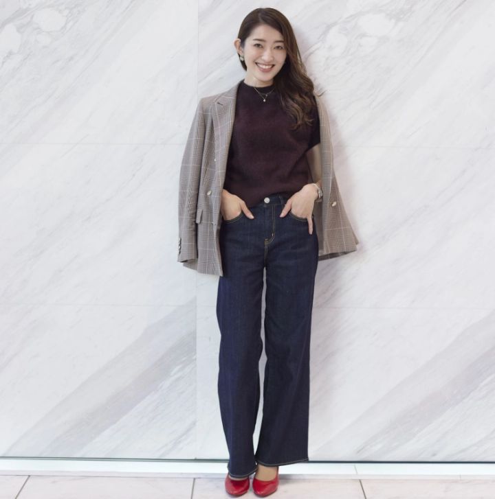 シックな色のコーデにクラシカルなジャケットをオン。赤パンプスで遊びをプラスしました!