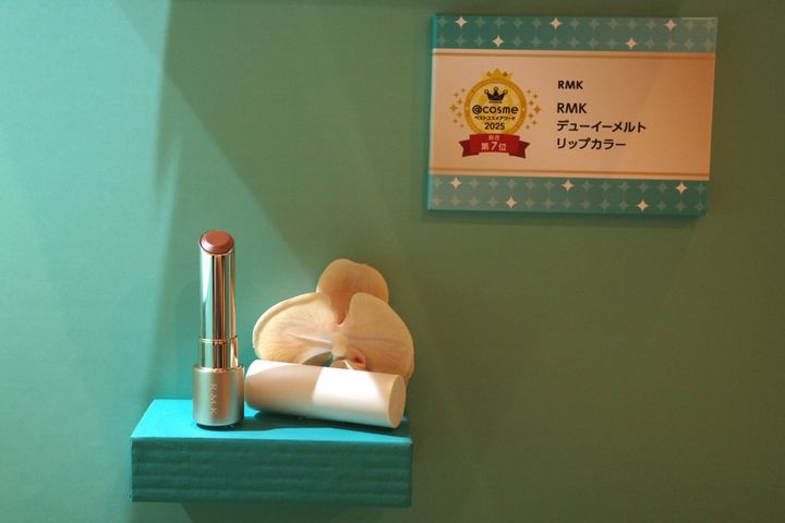 崩れにくさへの意識は、カラーメイクアップにも表れており、「飲み会リップ」というキーワードが@cosmeのクチコミで急増。総合7位を受賞した「RMK デューイーメルト リップカラー」は、今年の“飲み会リップ”を代表するアイテムです。落ちにくさの他に、肌を美しく引き立てるくすみカラーが評価されています。
