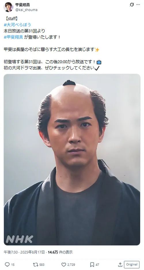舞台やミュージカル俳優としての実績が目立つ甲斐さんですが、なんと同年は、大河ドラマ『べらぼう〜蔦重栄華乃夢噺〜』(NHK)にも出演。