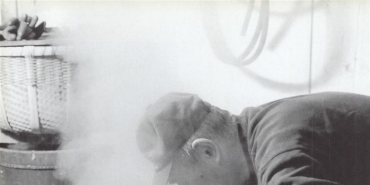 ごく細い緯糸は撚りをかけずに使うため、灰汁(あく)練りから糸染め、枠巻きまで、長年の経験と技術が必要とされる。糸枠に巻いた緯糸を木桶に張った水に浸す。湿らせた緯糸を濡れ緯とよび、精好仙台平の特徴のひとつである。「糸が管から出しやすく、織りも締まるんです」 撮影=大倉舜二