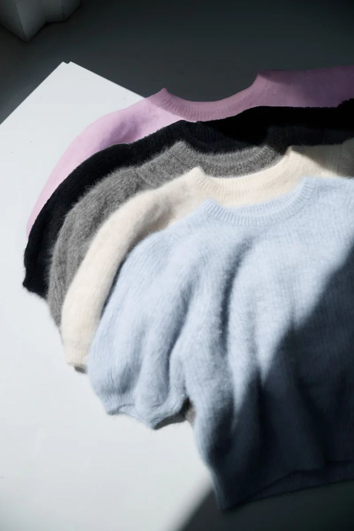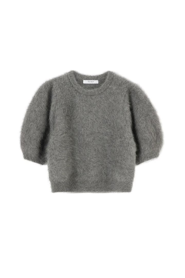 はい!大好物の長い毛足のニットです。もうこれだけでテンションが上がりますよね。可愛い! しかもパフスリーブで二の腕もしっかりカバー。上質なウールとカシミヤ混の糸で編まれていて、柔らかな風合い。肌触りもよく、しっかりと肉厚なので、大人が着るに十分なニットです。毛足は長いけど地の部分が薄くて、インナーが透けて心もとないニットってありますけど、そういう感じは一切ありませんので、安心してくださいね。半袖ニットって寒くない? っていうお声もあると思いますが、むしろ冬って都内だと室内も電車も暑くないですか? 仕事中も食事中も長袖ニットを着ていたら、腕まくりしている方が多いし、外を歩く際はグローブすればいいだけ。しかも私たちの年代だと、真冬でも暑いなって思う瞬間増えていますよね……っていうわけで半袖ニット、超使えます!