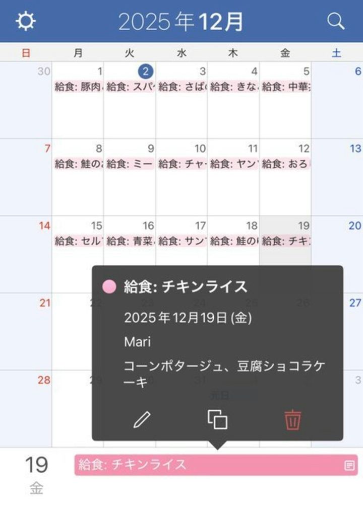 小学校の給食の献立表、写真とってGeminiにカレンダーに入力してと言ったら一発で完璧に1ヶ月分入力してくれた!!!