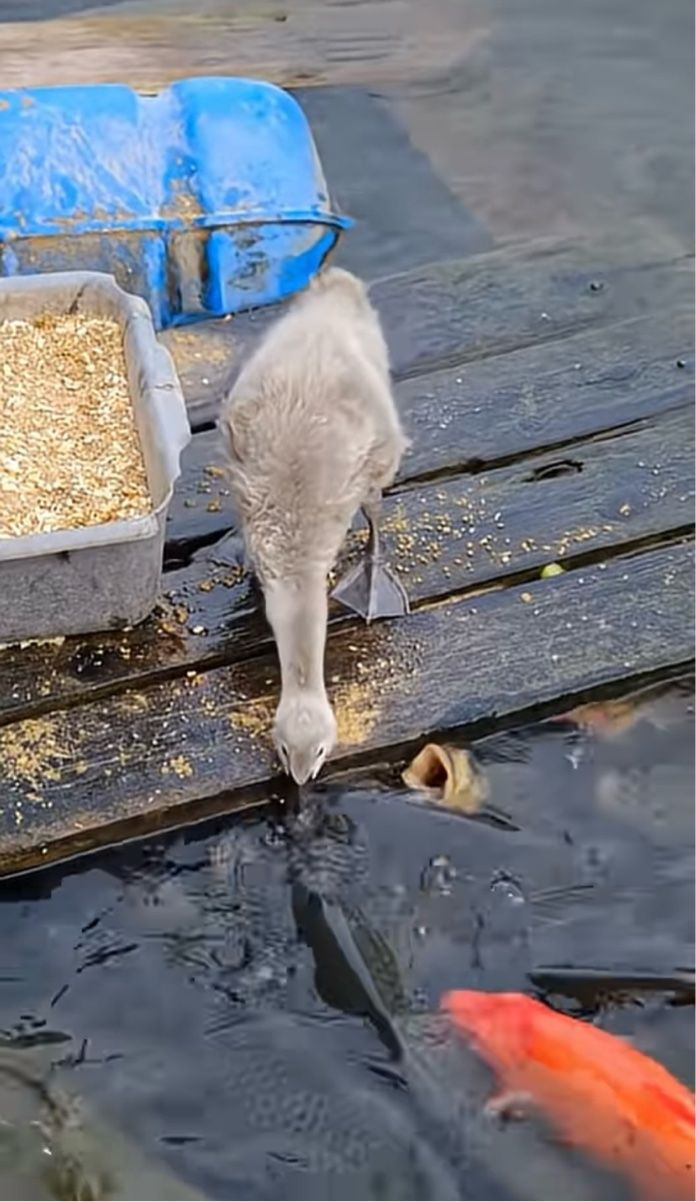なんと、このアヒルが魚たちにせっせと餌を届けてあげているではないですか!