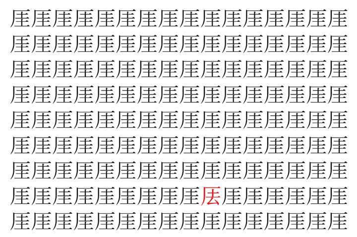 画像の中には、「厓」という漢字が縦に9行、横に16個並んでいます。 全部で144個となりますが・・・、そのうち1つは「異なる漢字」となってますよ!!