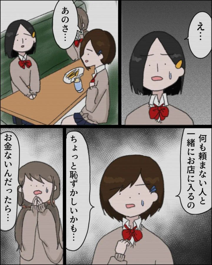 そう言われて「え・・」と驚くマリちゃんに、「あのさ・・何も頼まない人と一緒にお店に入るの、ちょっと恥ずかしいかも・・」「お金ないんだったら・・」と友達に言われ、