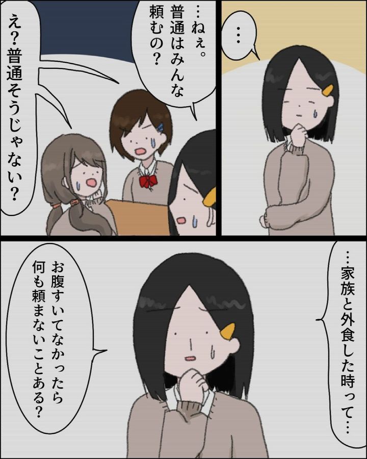そして「・・・」考え込んだ後、「・・ねぇ。普通はみんな頼むの?」と勇気を出して聞いてみると、「え?普通そうじゃない?」と声を揃えて言う友達の言葉を聞いて、「・・家族と外食した時って・・お腹すいてなかったら何も頼まないことある?」と友達に家族で外食した時のことを聞いてみると、