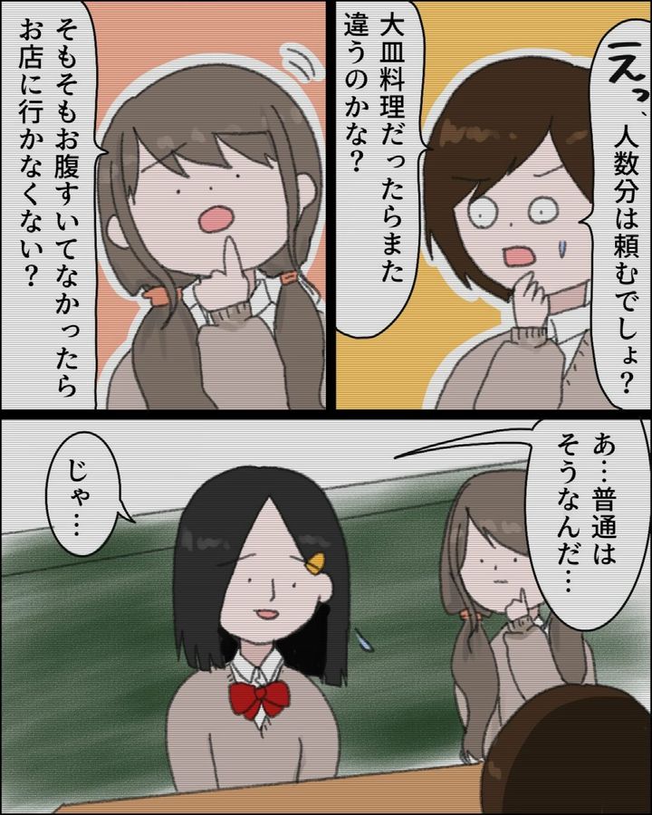 「えっ、人数分は頼むでしょ?大皿料理だったらまた違うのかな?」「そもそもお腹すいてなかったらお店に行かなくない?」と友達が口々に言うのを聞いて、「あ・・普通はそうなんだ」とマリちゃんが寂しそうに言いました。