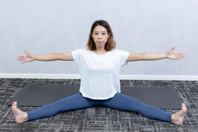 (1)しっかりと骨盤を立てて両脚を開き、両腕を床と水平にまっすぐ伸ばす