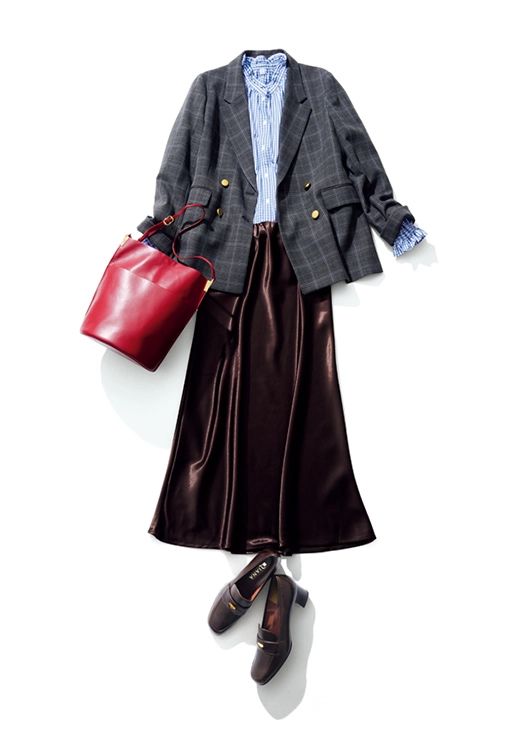 フリルネックブラウス¥2,290/GU サテンスカート¥5,000/Olu. ジャケット¥17,990/ANYSIS(オンワード樫山) ショルダーバッグ¥6,490/カシュカシュ(アンビリオン) コインローファー¥18,150/ダイアナ(ダイアナ 銀座本店)