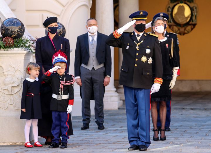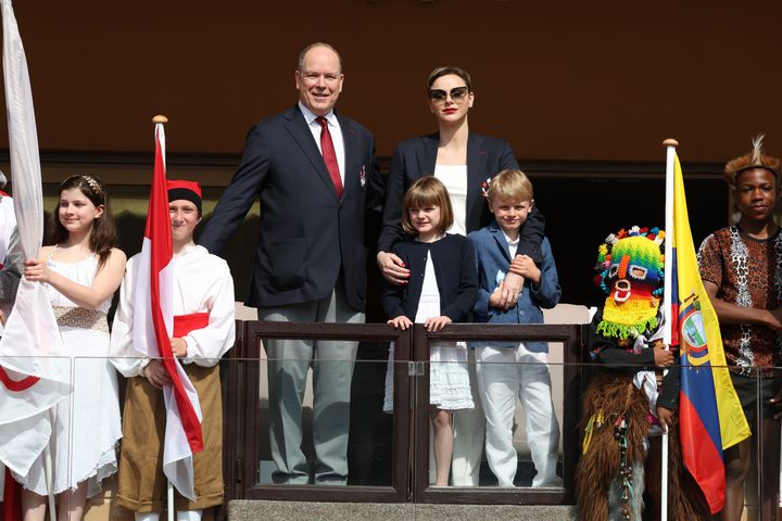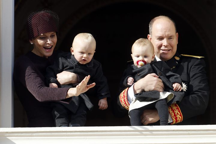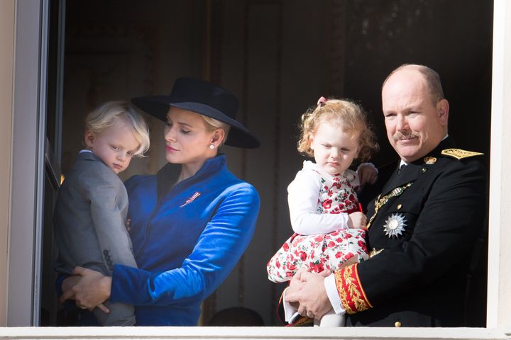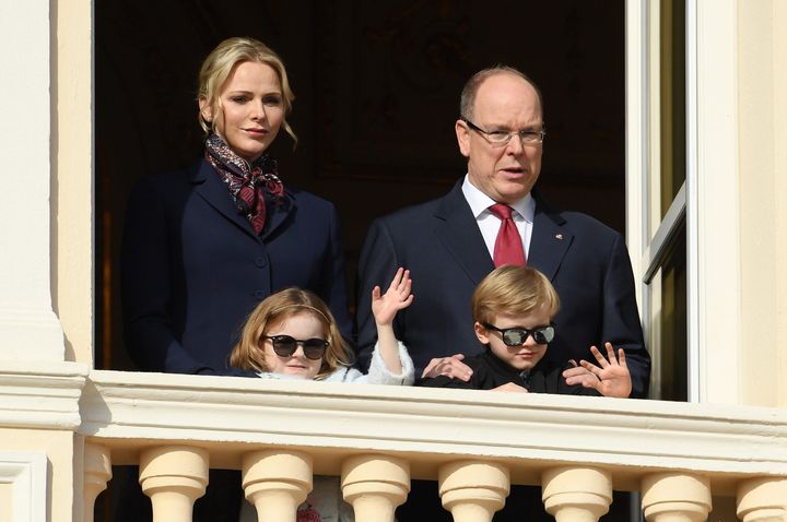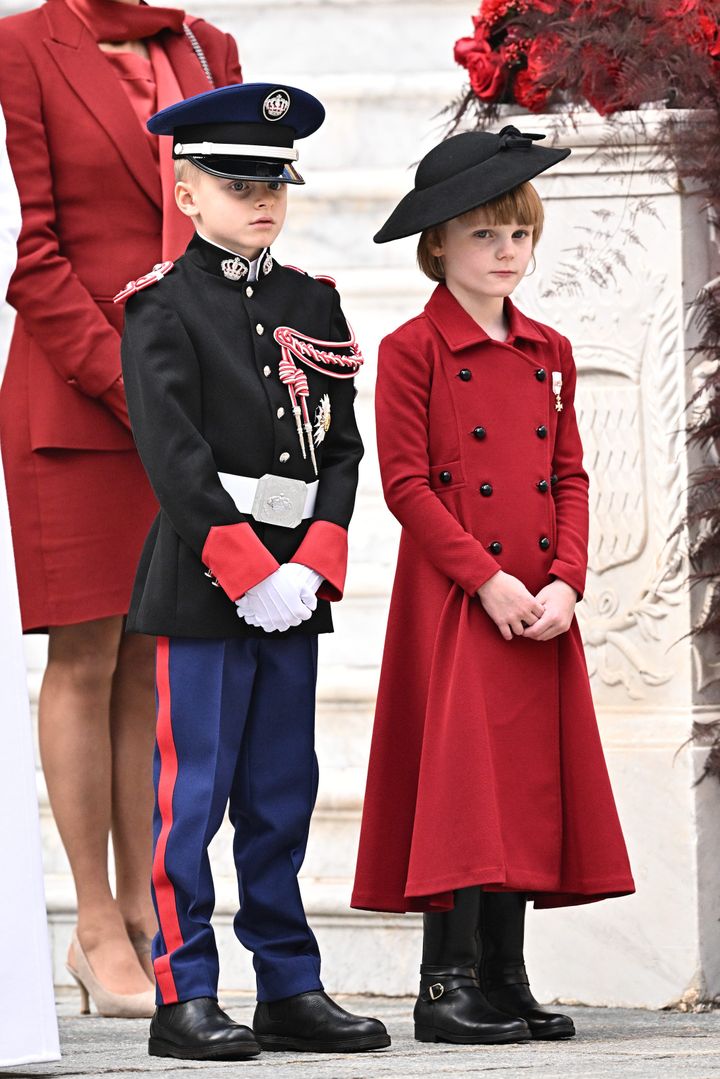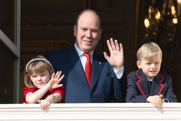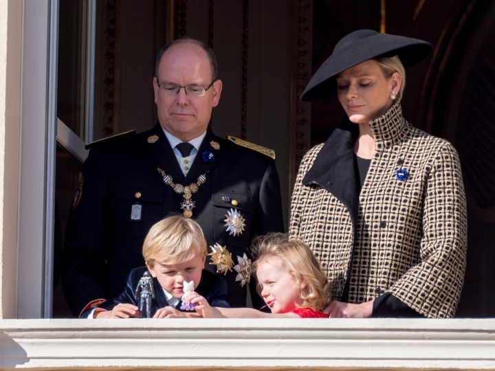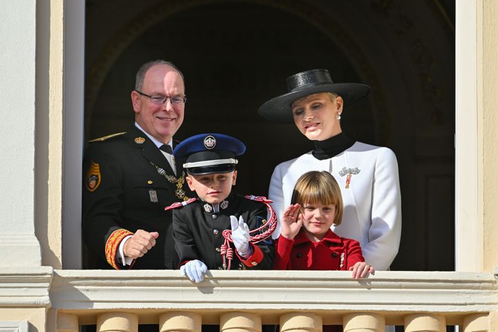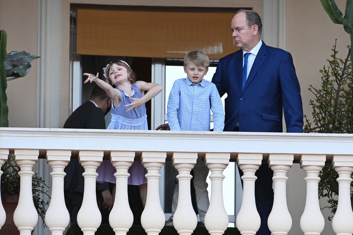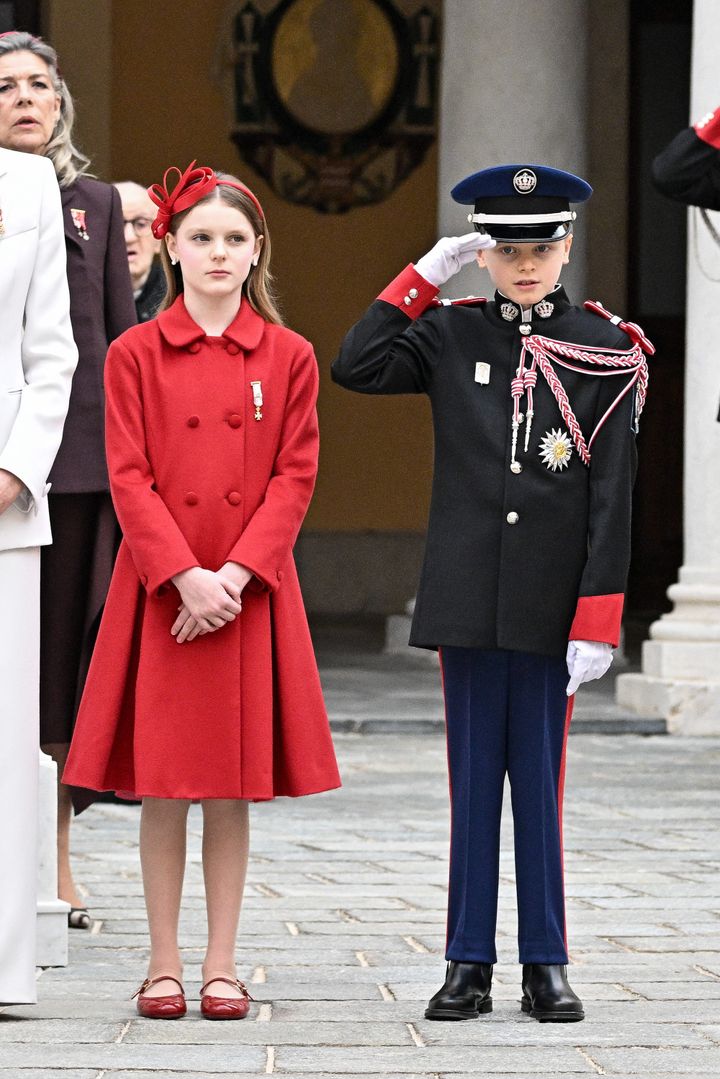 モナコ公国の守護聖人に捧げられる聖デヴォート教会の行事で、伝統に従い、父親とともに宮殿のバルコニーから手を振る2人。赤とネイビーの親子リンクコーデも素敵です。