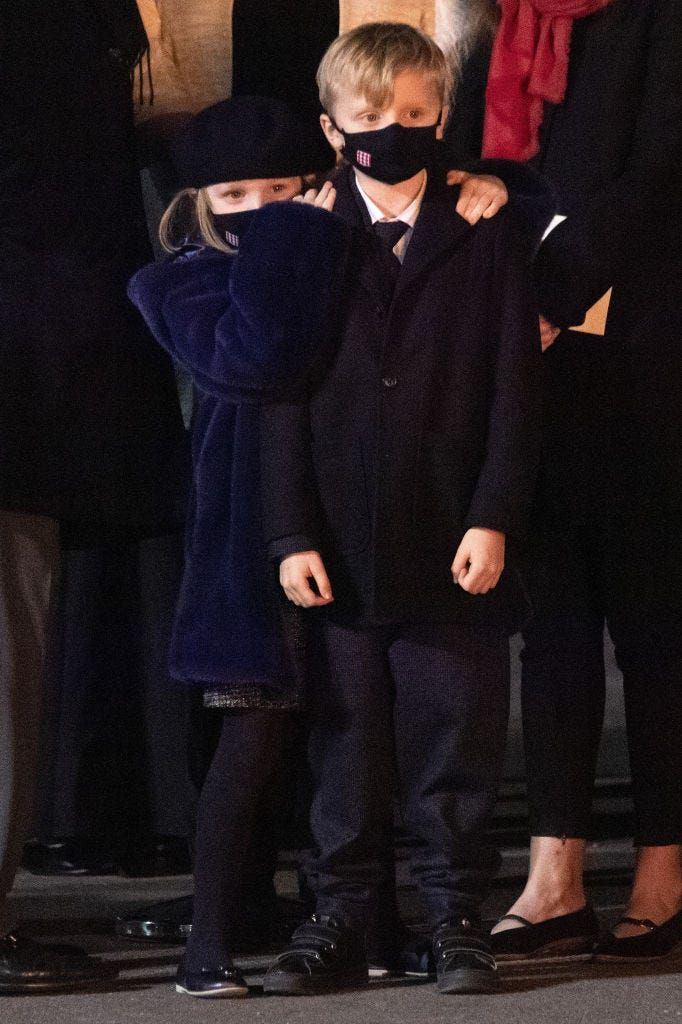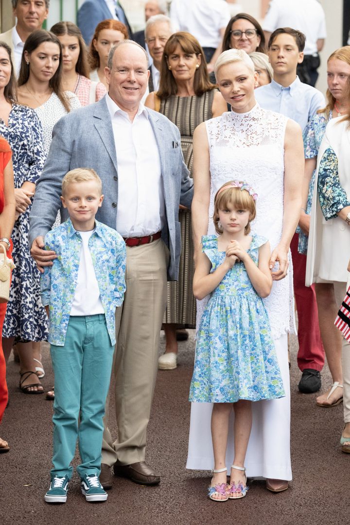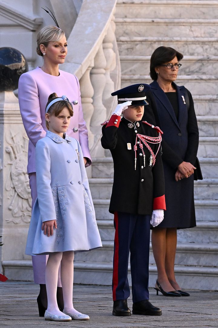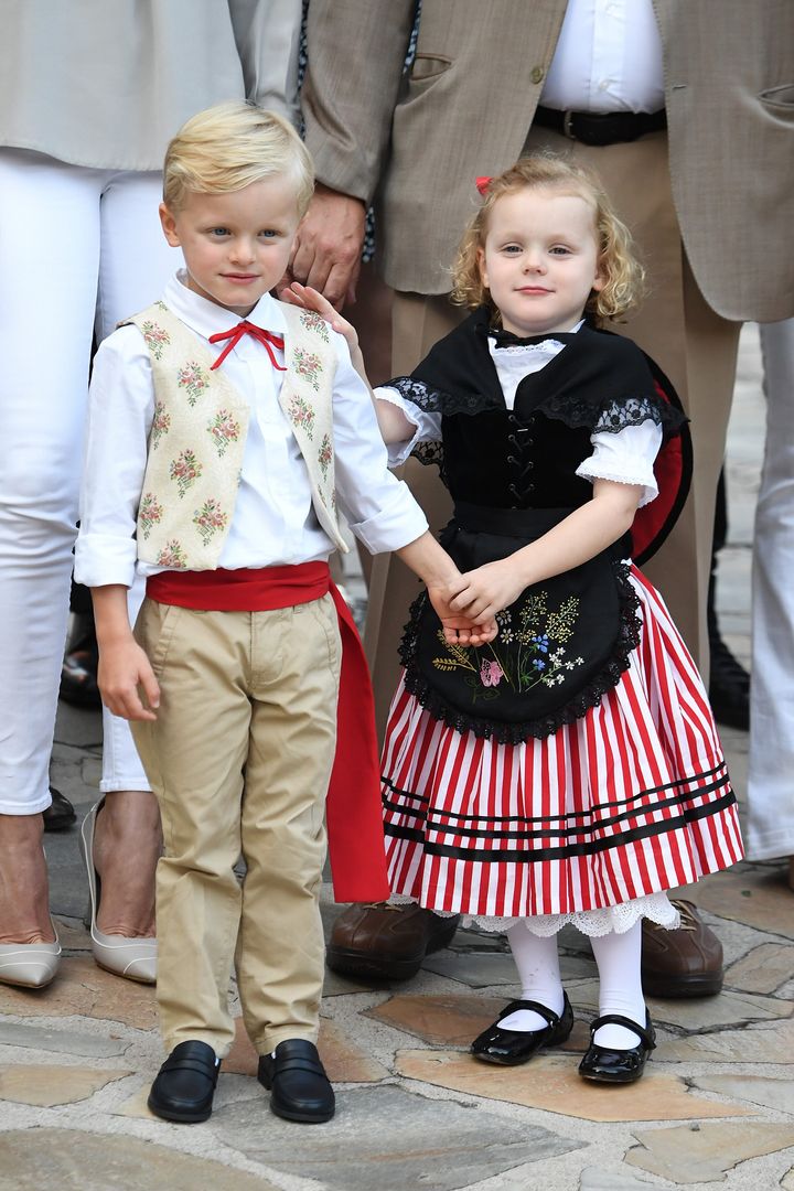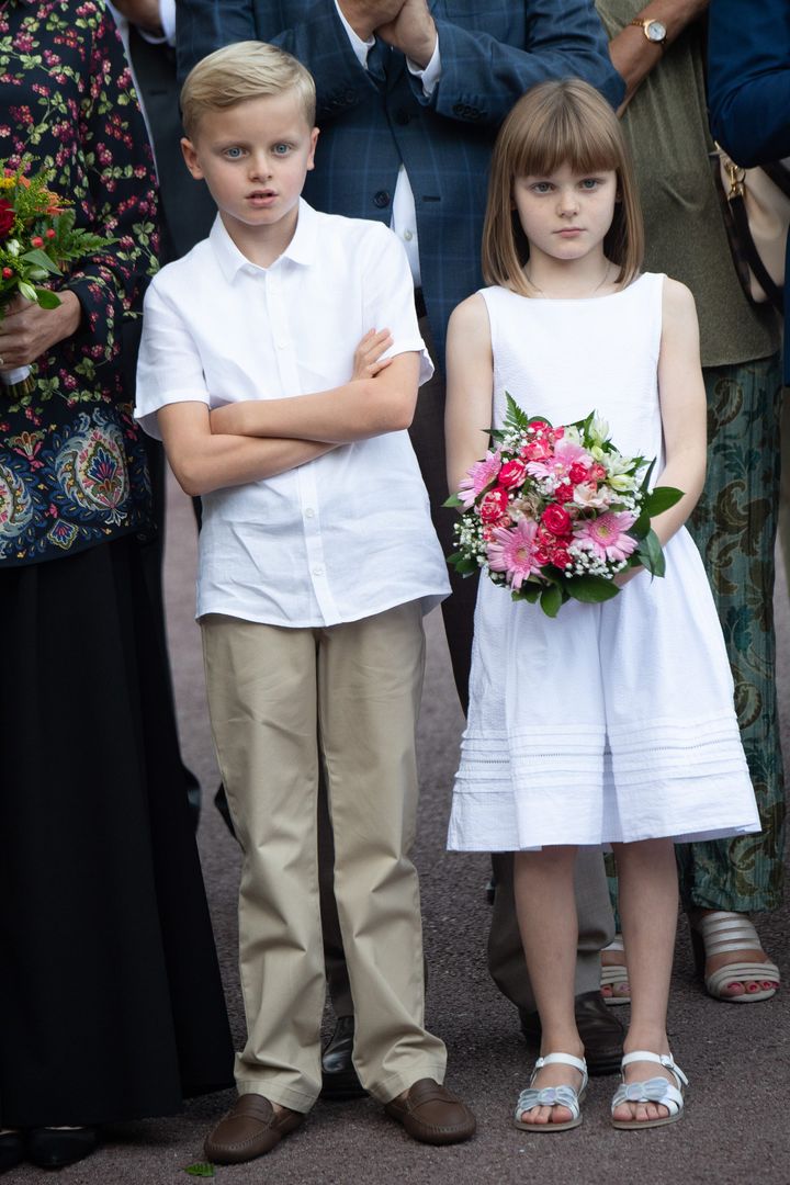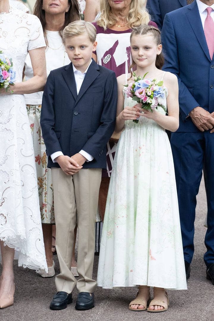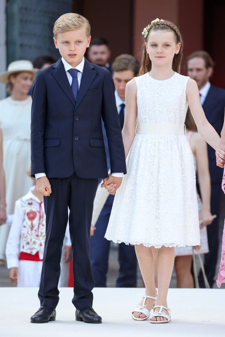 父アルベール大公の即位20周年を祝うセレモニーが行われ、双子もおしゃれに着飾って参加。ダークネイビーと白のコントラストがステージで映えます。