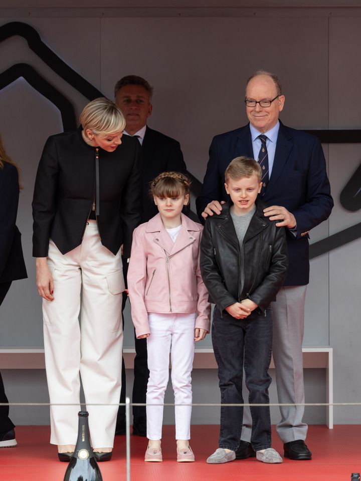 モナコ3大モーターレースのひとつ、モナコ・Eプリにやってきた一家。双子はそろってライダースジャケットとデニムを着こなし、珍しく辛口なファッションを披露してみせました。