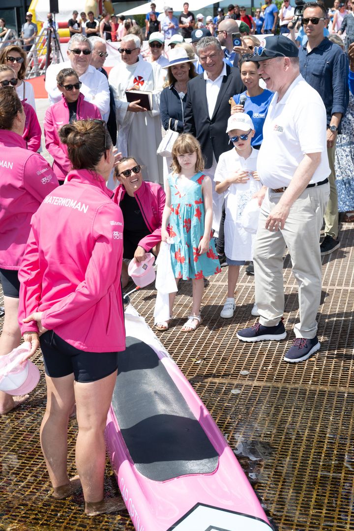 モンテカルロでチャリティイベントとして行われた水上バイクレース、リビエラ・ウォーターバイク・チャレンジ2022に、父とともに参加。初夏のバカンス風ルックが日差しに映えます。