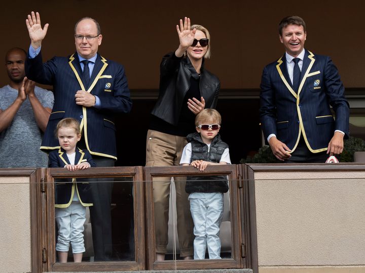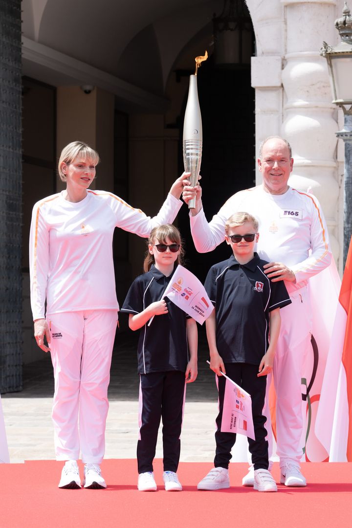 モナコに到着したオリンピックの聖火を掲げる夫妻と、サングラス姿がクールな双子は、スポーティルックで統一。実はアルベール大公とシャルレーヌ公妃はともに、元オリンピック選手でもあります。