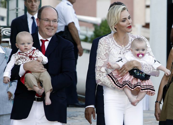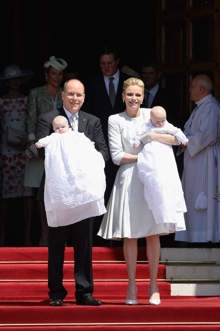 当時まだ生後6カ月だったジャック公子とガブリエラ公女。真っ白なおくるみで、モナコ大聖堂で行われた洗礼式にやって来ました。