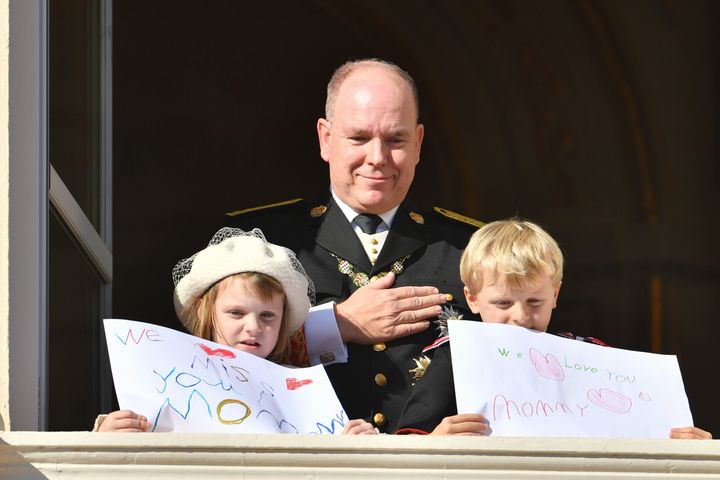 モナコの建国記念日、式典に姿を現した双子の様子。故郷の南アフリカで感染症に罹患し半年間帰国できなかった母シャルレーヌ公妃に向け、愛を伝えるメッセージカードを掲げました。