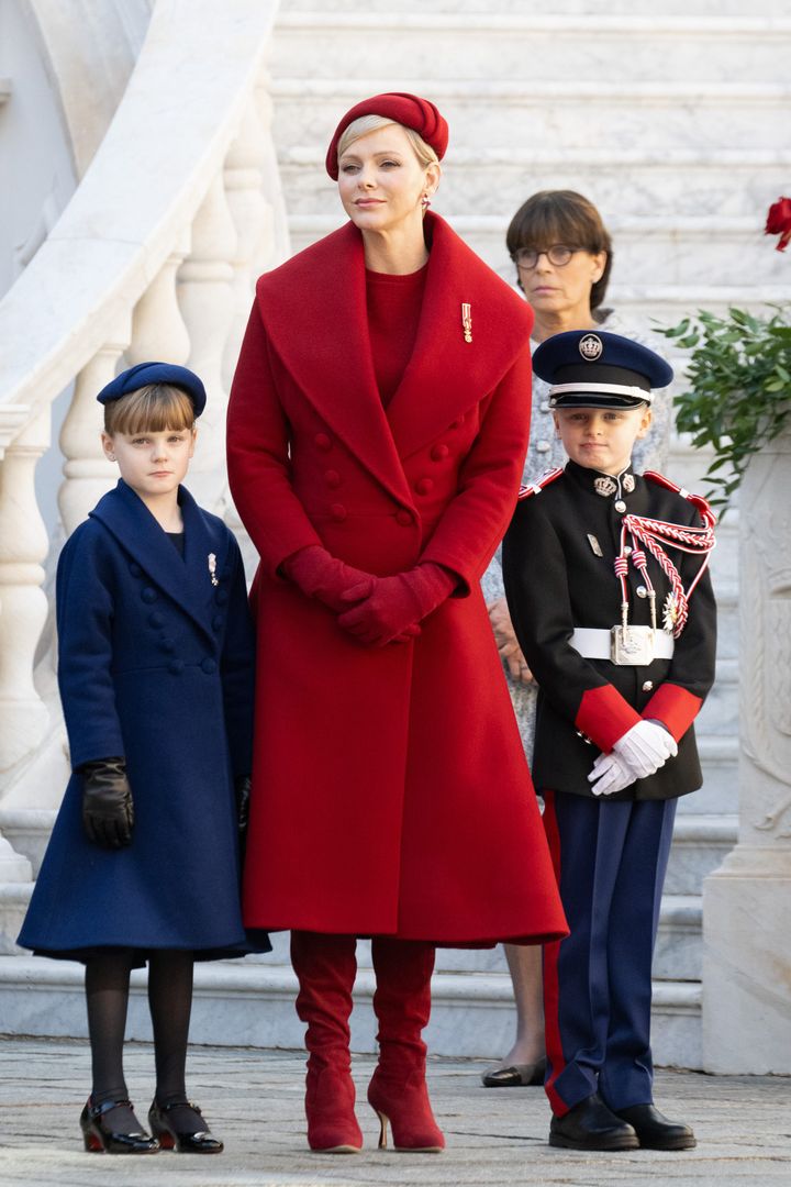 2025年の建国記念日にも、もちろんバルコニーにお出まし。母シャルレーヌ公妃は白、ガブリエラ公女は赤のルックに身を包み、モナコ公国の国旗を彷彿させる上品ファッションを披露しました。