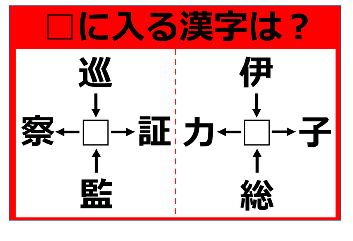 【漢字パズル】巡□、□察、監□、□証 この□に入る漢字を当ててください!