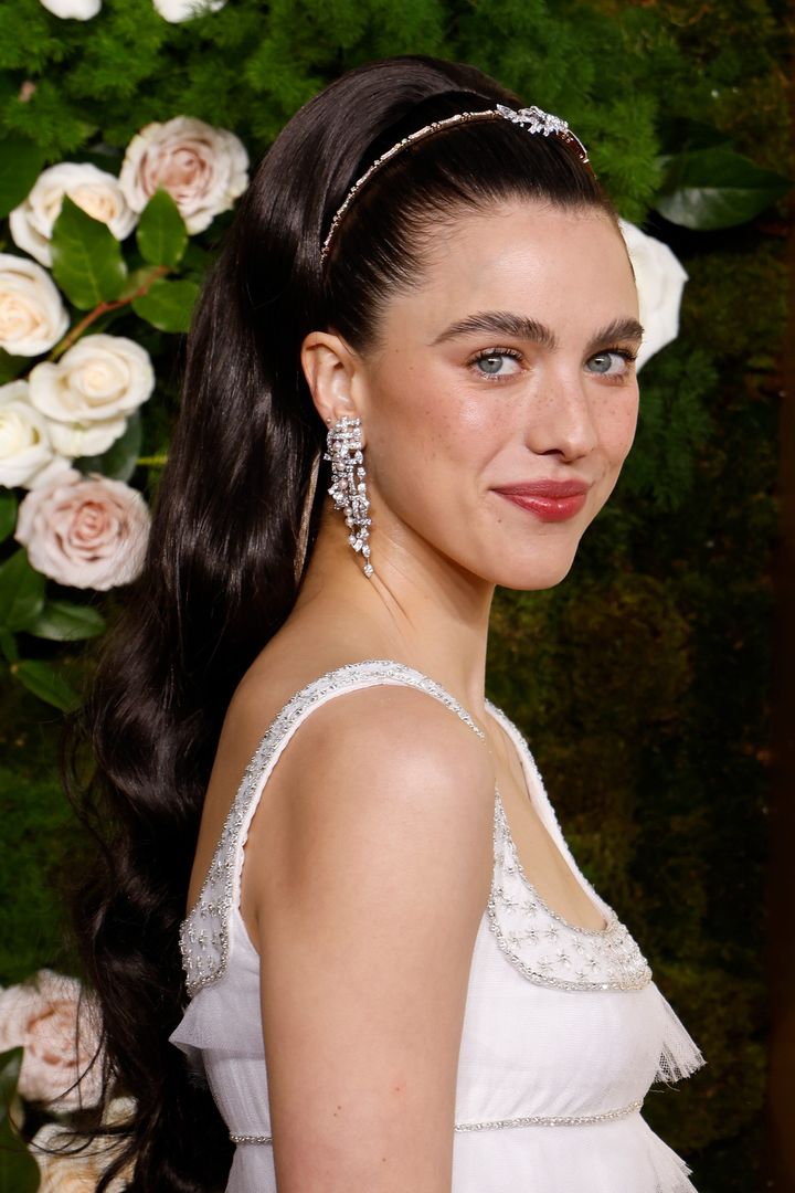 頭頂部にボリュームをもたせたハーフアップに、ダイヤモンドが煌めくヘッドバンドをオン。メイクはほのかなチークと上品なリップカラーで少女のような清らかさを漂わせて。シャネルの白ドレスとともに高貴なプリンセスのようなルックです。