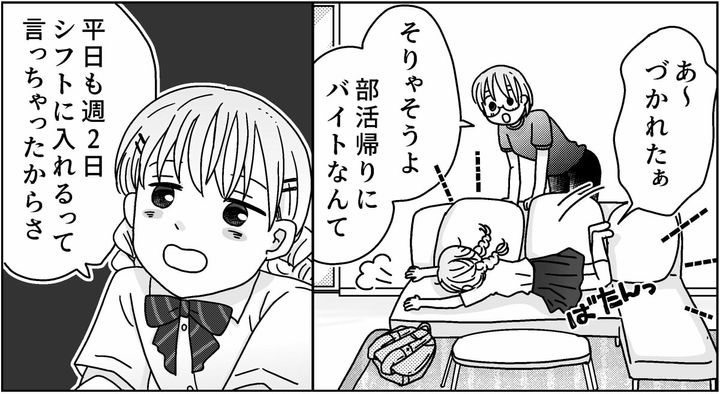 部活のあとにバイトに入って帰宅してきた娘。ソファに倒れこみ「づかれたー」
