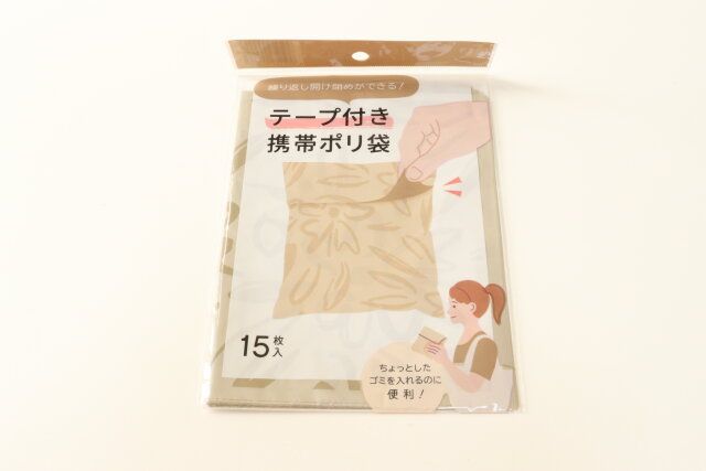 今回は、ダイソーで見つけた『テープ付き携帯ポリ袋 ベージュフラワー』をご紹介しました。
