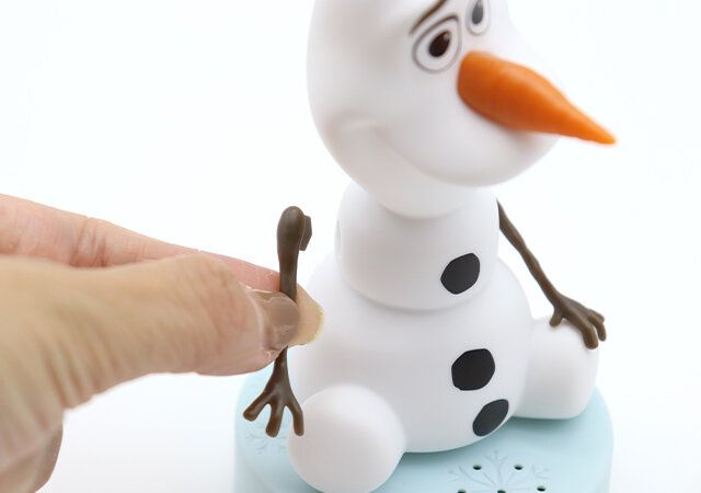 スイッチを入れると、オラフの愛らしいボイス「やぁみんな、ぼくはオラフ。ぎゅーって抱きしめて!」が流れます。
