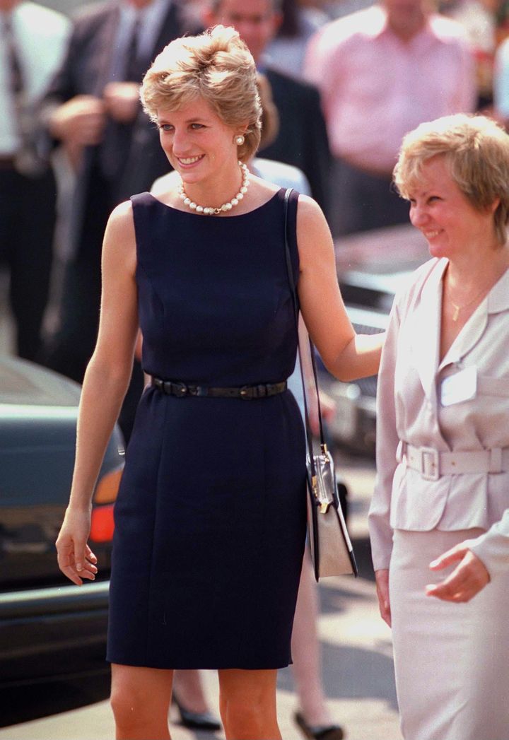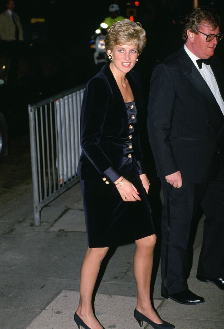 映画のプレミアに姿を見せたダイアナ妃は、金のボタンをあしらったLBDで90年代スタイルを体現。