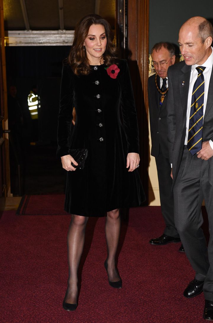 2017年のリメンブランス・デーの追悼行事では、ベルベットで仕立てられた「キャサリン・ウォーカー」のコートドレスをチョイス。クリスタルがあしらわれたボタンが輝きを添えている。