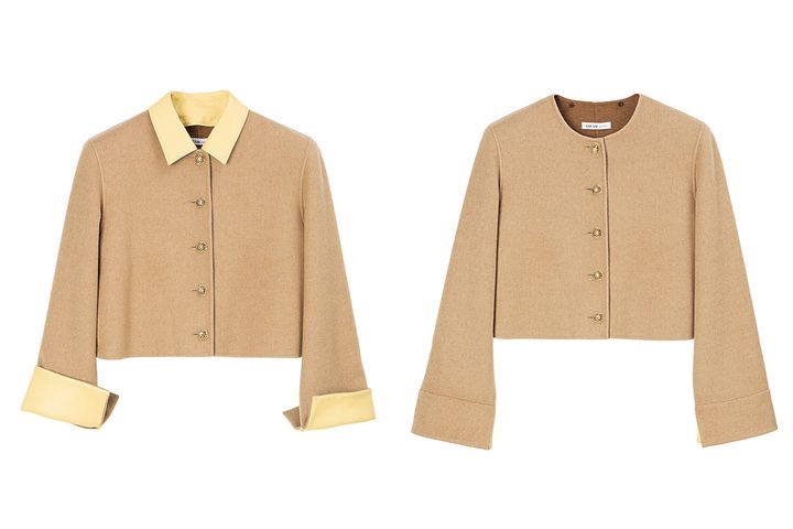 取り外し可能なイエローのフェイクレザー襟が付いたダブルフェイスのショート丈ジャケット。袖口を折り返すとレザー部分がお目見え。優しいベージュ色とソフトな肩パッド入りで、きちんと感があるのがエレ派向き。