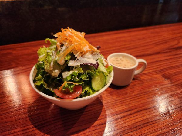 注文後すぐにサラダとスープが登場!写真の通り、モリモリのサラダと今回はクラムチャウダー?でした。