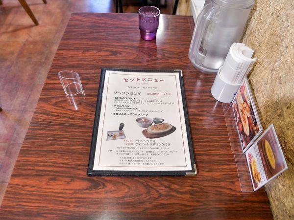 セットメニュー「グラタンランチ」は、グラタン単品に+380円で お好みのグラタン(ライスグラタン・マカロニグラタン・ラザニア・スパゲッティグラタンから選べます)にボールサラダ(名物オニオンサラダ・シーザーサラダ・グリーンサラダから選べます)と手仕込みカップコーンスープが付いています。