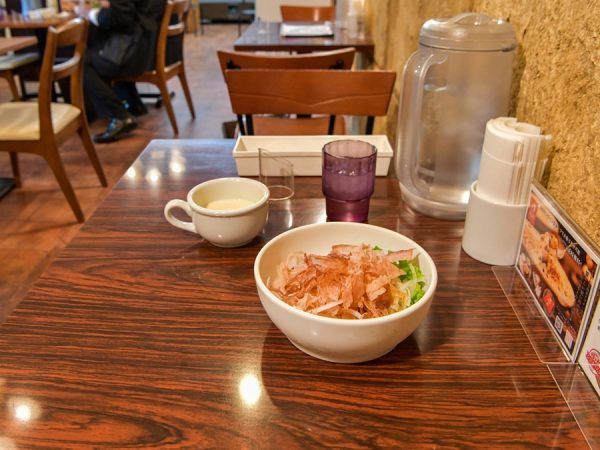 セットのオニオンサラダと手仕込みカップコーンスープ。 鰹節で見えていませんが、スライスされたオニオンがたくさん入っています! ドレッシングとの相性も良くて、さっぱりといただけます♪ 手仕込みカップコーンスープは、優しい味でほっこりします。