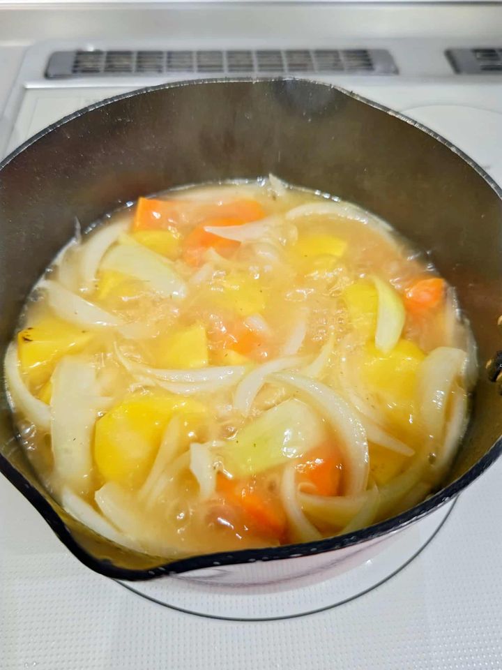 2. 水と顆粒だしを加えて強火で沸騰したら、さらに3分加熱する。