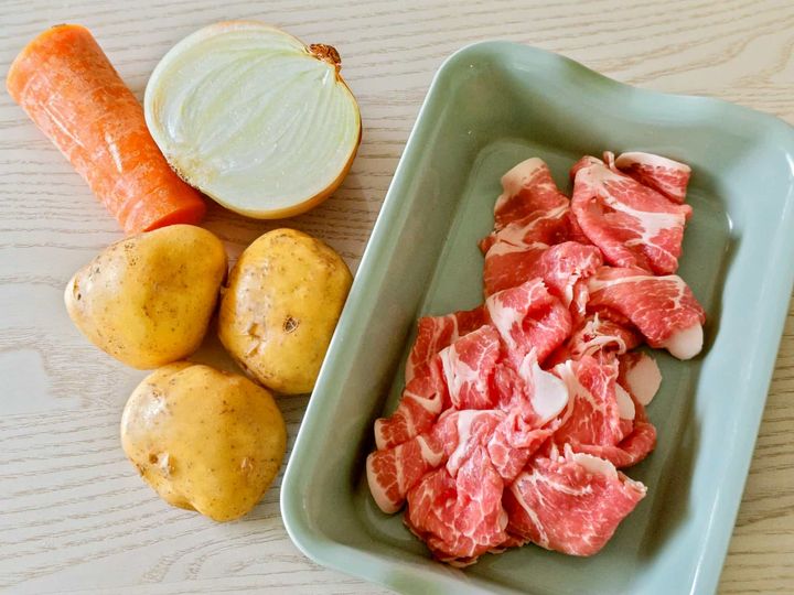 1. じゃがいもは皮をむいて4等分に切る。にんじんは1cm厚の半月切り、玉ねぎは8等分のくし形切りにする。豚肉は5cm程度に切る。鍋に米油を入れ強火で熱し、野菜を全て入れ2分炒める。