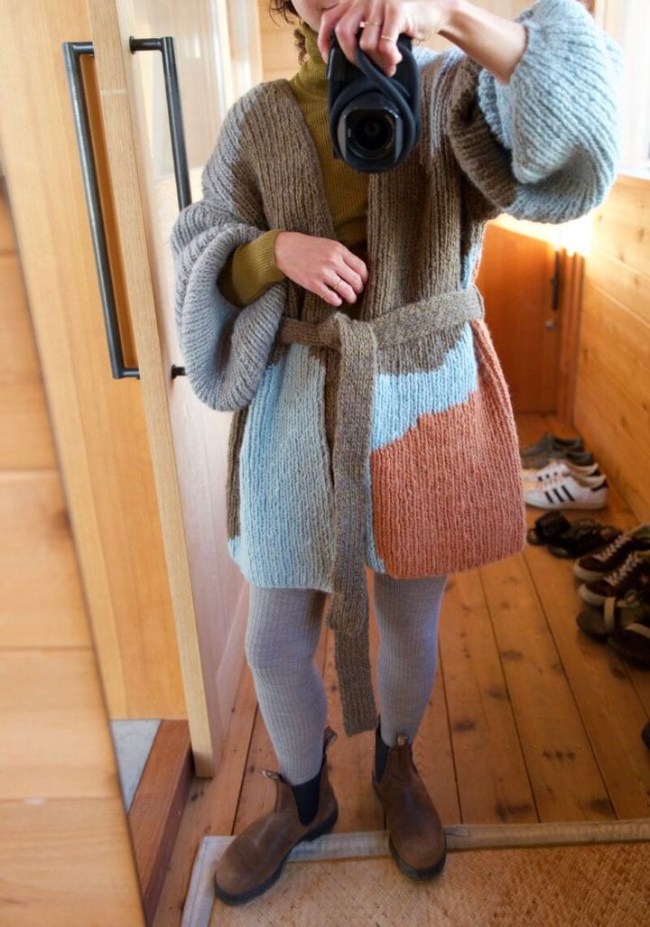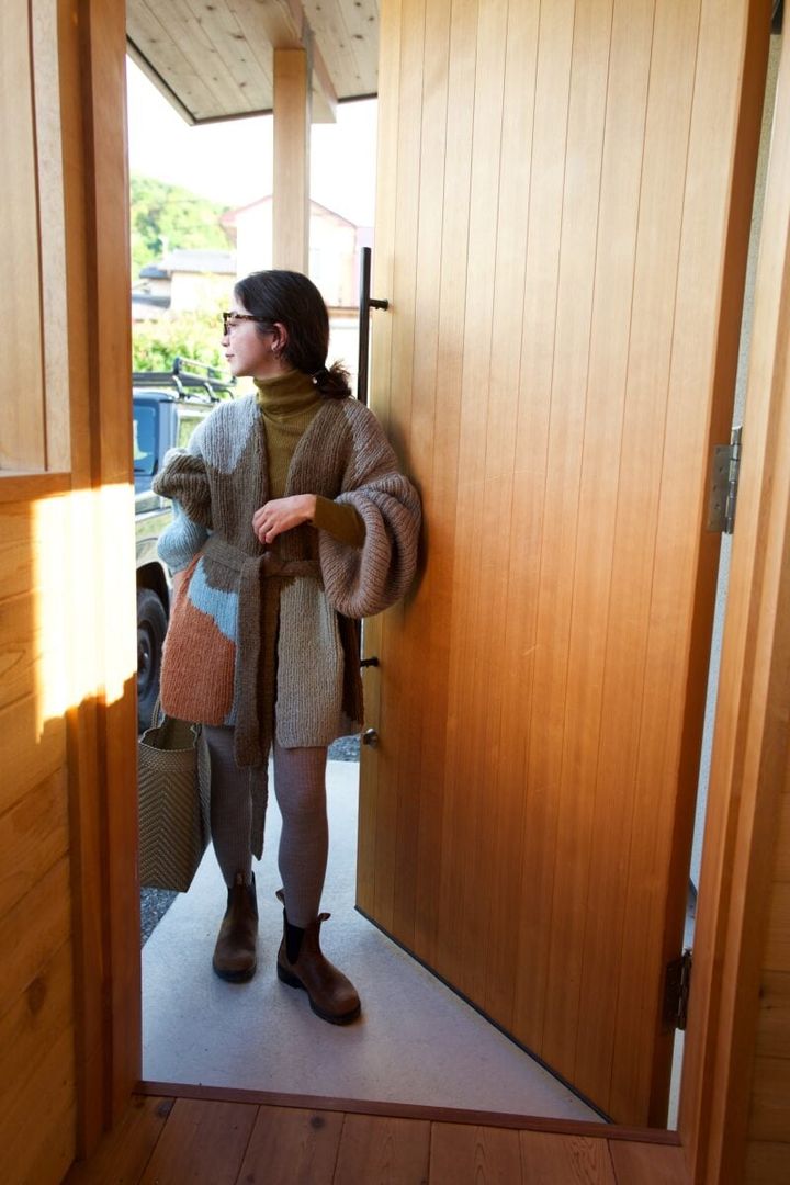 「PURのニットガウンは、ヒップまで隠れる丈感が可愛くてお気に入り。ゆったりとした作りなので、中のコーディネイトも楽しめます。ガウンのベルトはゆったりと垂らして、リラックス感のある着こなしに。リブタイツとショートブーツをあわせて、足元まであたたかく」(PURデザイナー・八木下泉さん)