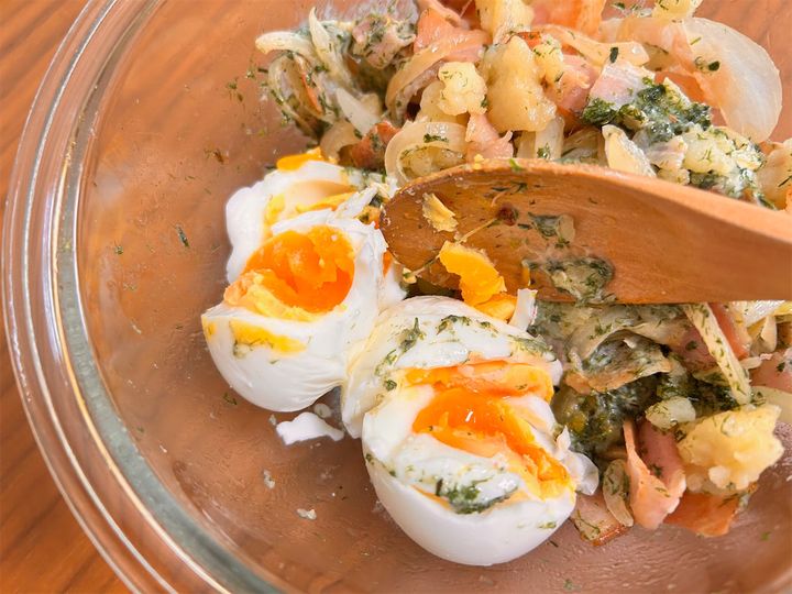 6. 5に青のりとマヨネーズを入れて混ぜ合わせる。端に寄せて1のゆで卵を粗く潰し、全体を軽く混ぜる。