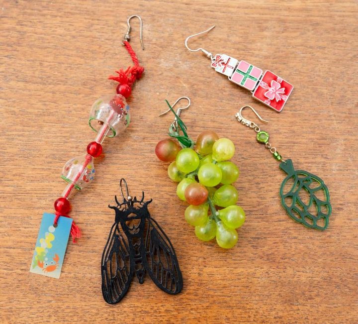 風鈴、セミ、ブドウ、ホップ、ギフト箱のピアス。「遊び心やインパクトのある小物が好き。風鈴はガーデニング用の飾りをピアスにリメイクしました」