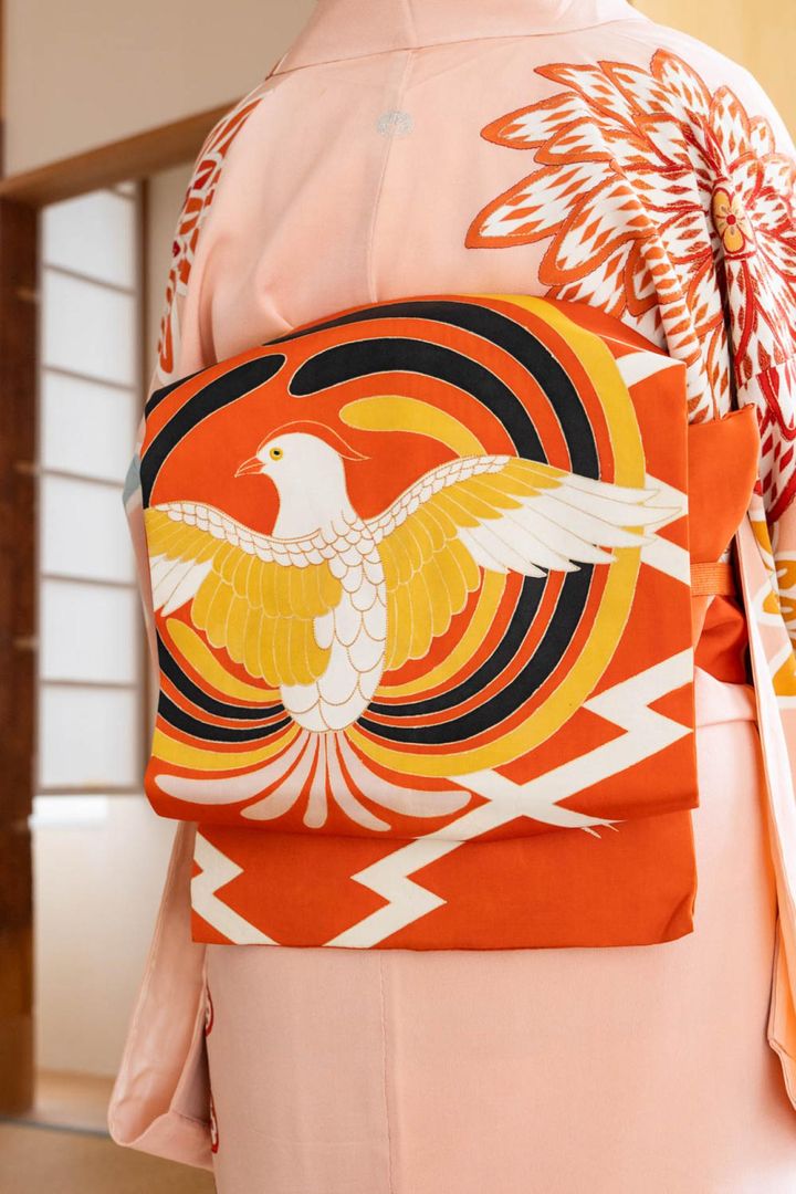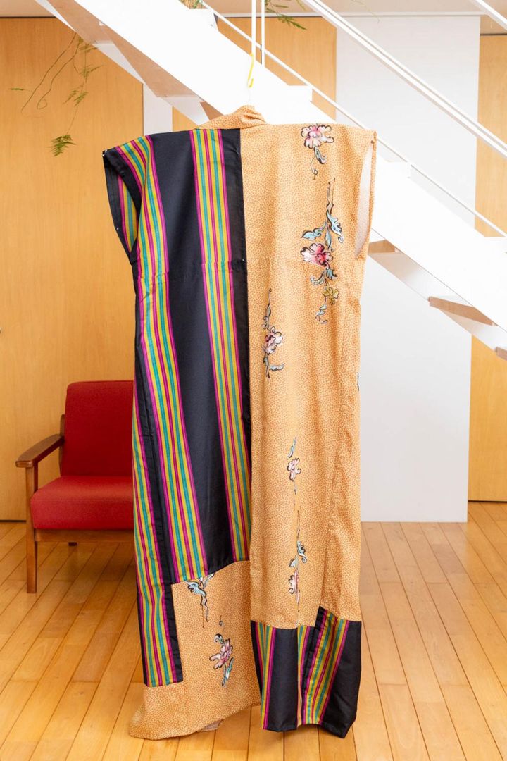 「洋服だったらあまり合わせない色ですよね。たぶん昔の訪問着だと思いますが、この配色がちょっとニューメキシコっぽくて気に入っています。菊の花の中に梅や紅葉が描かれていて、異なる季節が混在しているところが面白いと思います。腰には黒の飾り腰紐。文献によると室町時代はこうやって垂らしていたようなんですよ。それがおしゃれだなと思って考案した、私のオリジナルの着こなしです」